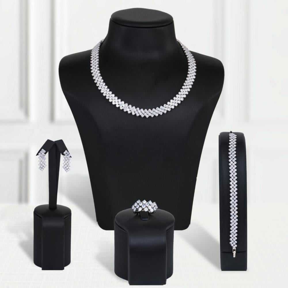 ارتقِ بإطلالتك مع طقم بديل الذهب بريق القمر المصنوع بدقة وفخامة ليكون خيارك المثالي للمناسبات الخاصة. يتميز هذا الطقم بتصميمه الأنيق وأحجار الزركون الفاخرة التي تضفي بريقًا لا يُضاهى وتنعكس بأضواء قوس قزح المبهرة لتمنحك جاذبية لا تُقاوم.