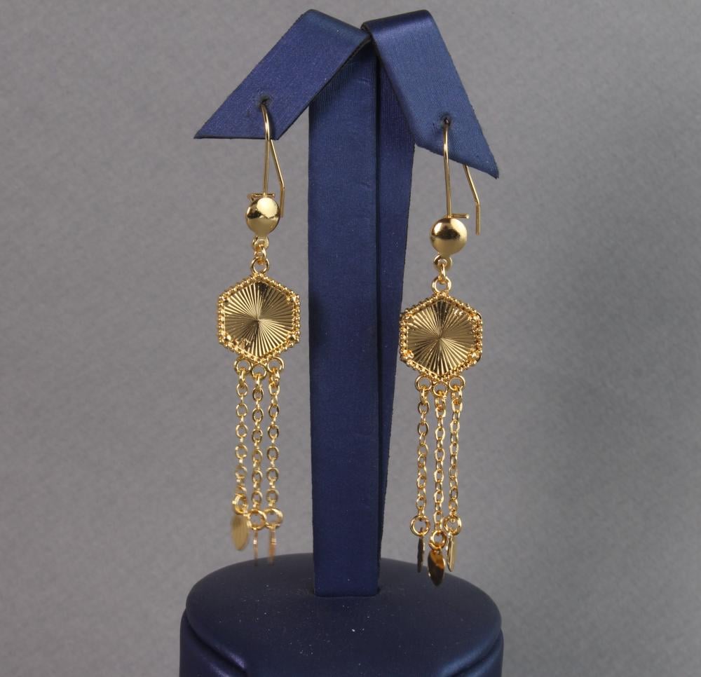 لإطلالة مشرقة بدقة هندسية، اختاري حلق شنكار بديل الذهب شمس السداسي، حلق ذهبي مصقول بتفاصيل متناغمة تعكس أناقتك مع كل خطوة.