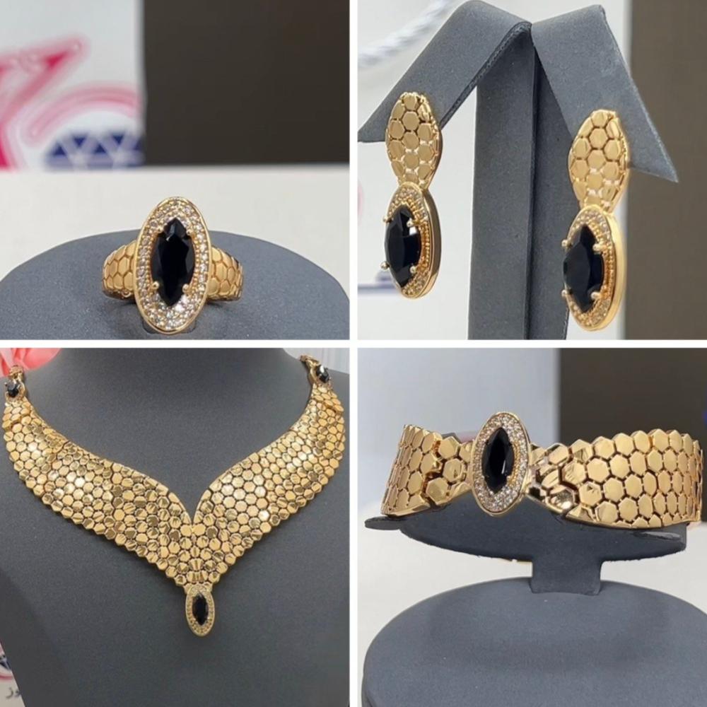 - المكونات: عقد رئيسي – سوار عريض – خاتم بحجر بيضاوي – حلق أنيق بنفس الطابع