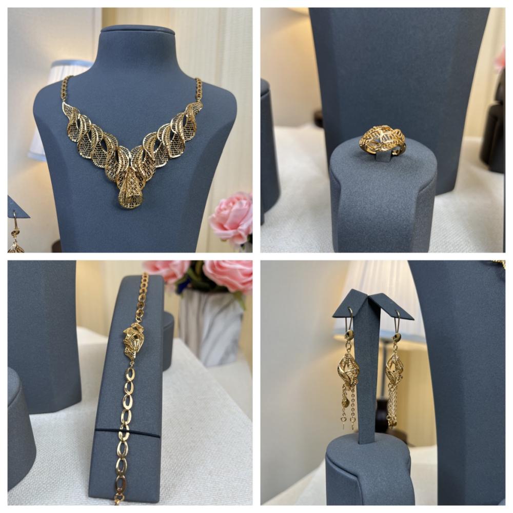 • المكونات: قلادة، أقراط، إسوارة، وخاتم