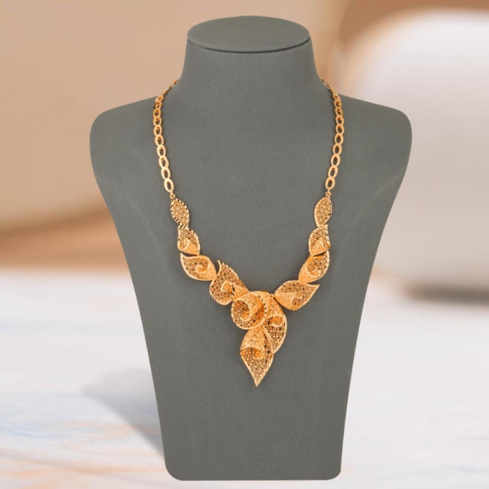 ارتدي لمسة من الفخامة مع طقم بديل الذهب الأوراق الذهبية المطلي بماء الذهب، تصميم يجسد الأناقة والتميز. مثالي لإطلالاتك اليومية والمناسبات الخاصة.