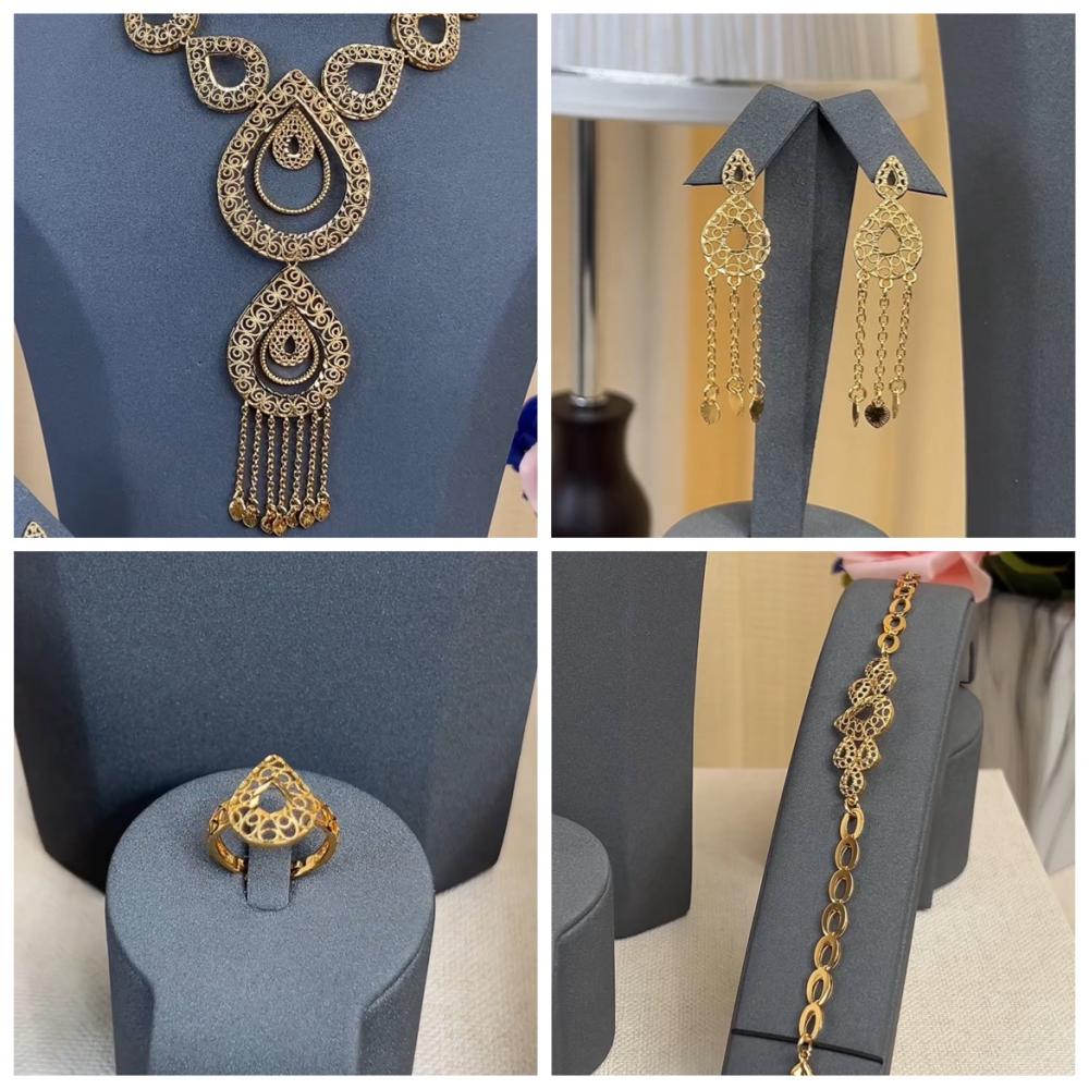 طقم بديل الذهب قطرة الذهب يعكس جمال التفاصيل وروعة التصميم. بتشكيلة أنيقة تتضمن عقدًا يتدلى بسلاسة على العنق، وأقراطًا تضفي لمسة من الرقي، وخاتمًا مفتوحًا يناسب جميع المقاسات.